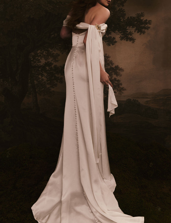 Be romantic. This softly draped gown by Renhue will give you versatility and romance. A structured bodice holds up a cowl front neck drape and convertible arm sashes that can be tied off the shoulder, on the shoulder, or some combination of the two. The skirt has asymmetrical pleat details at the hip. To finish the look, covered buttons run from the back neckline to the hemline of skirt.
