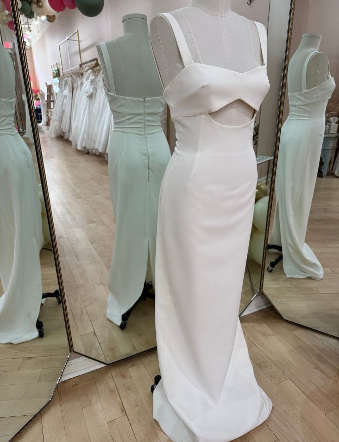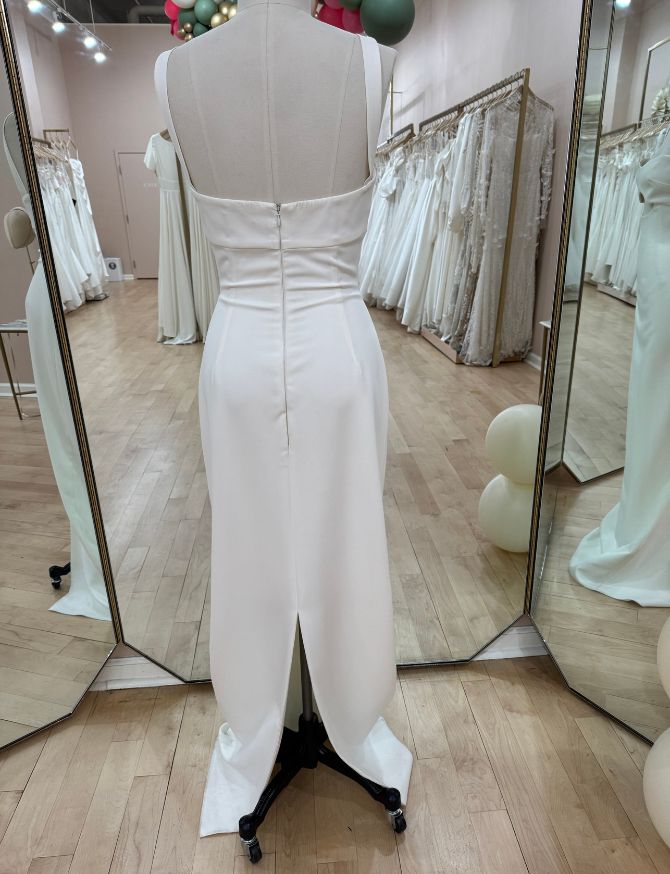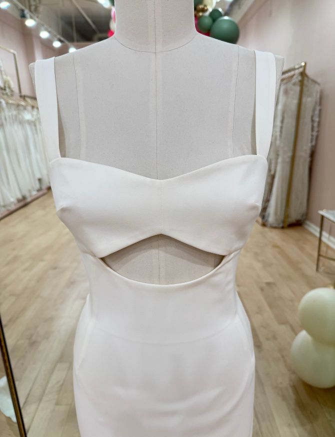 Column skirt wedding dress with a sweetheart neckline, thick straps, and a fun center front cut out. The back of the column skirt has a center back slit.