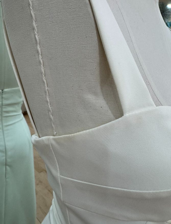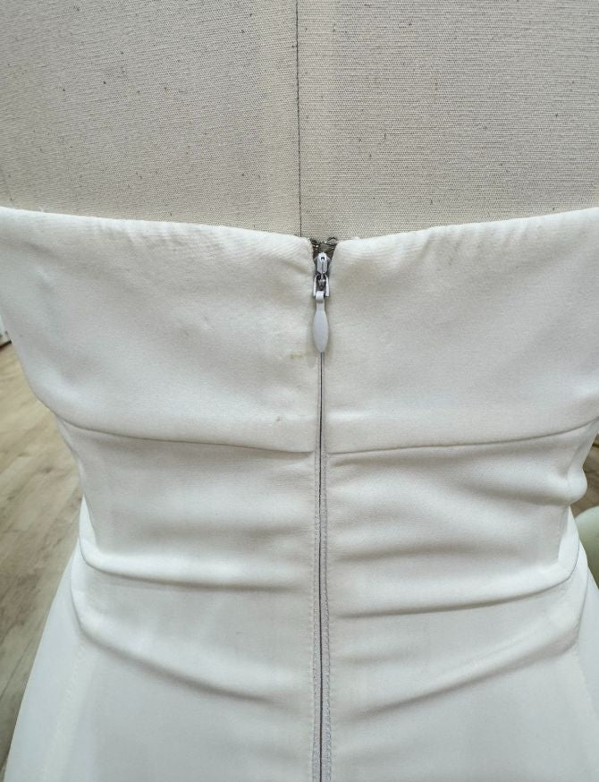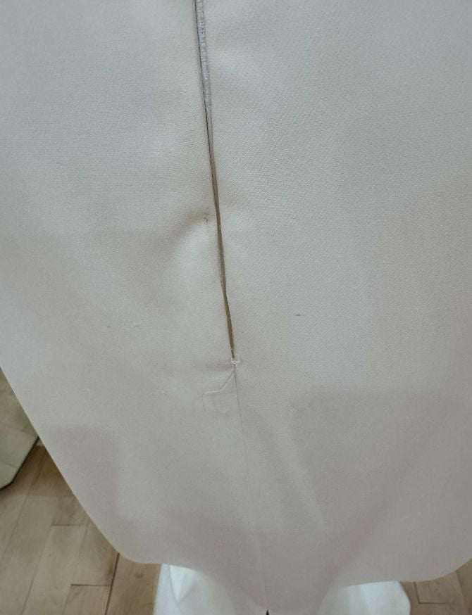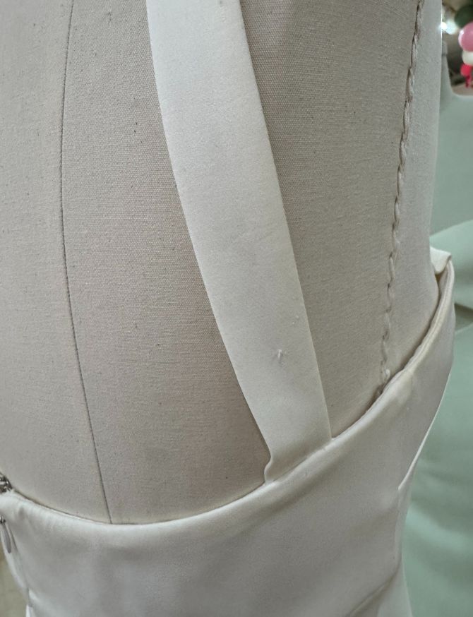 Gown has slight markings that would benefit from dry cleaning. Bottom of zipper is loose which could be fixed in tailoring.