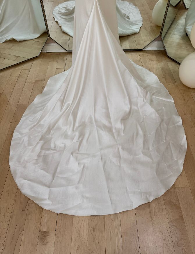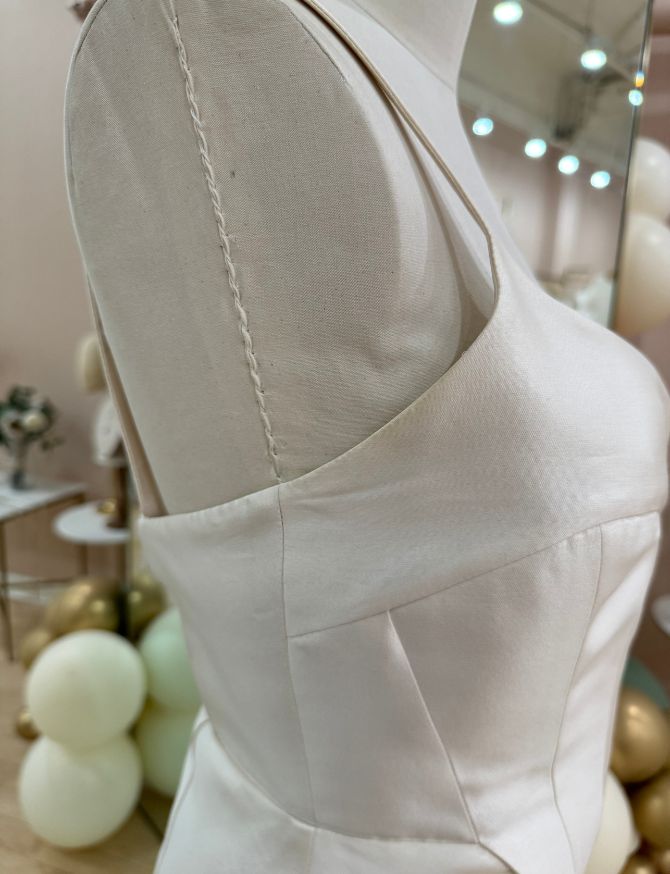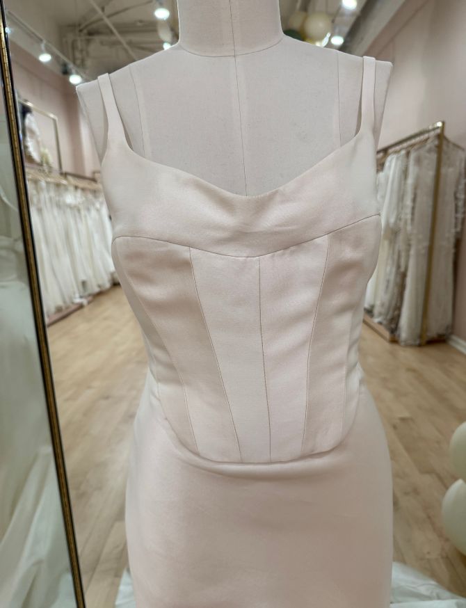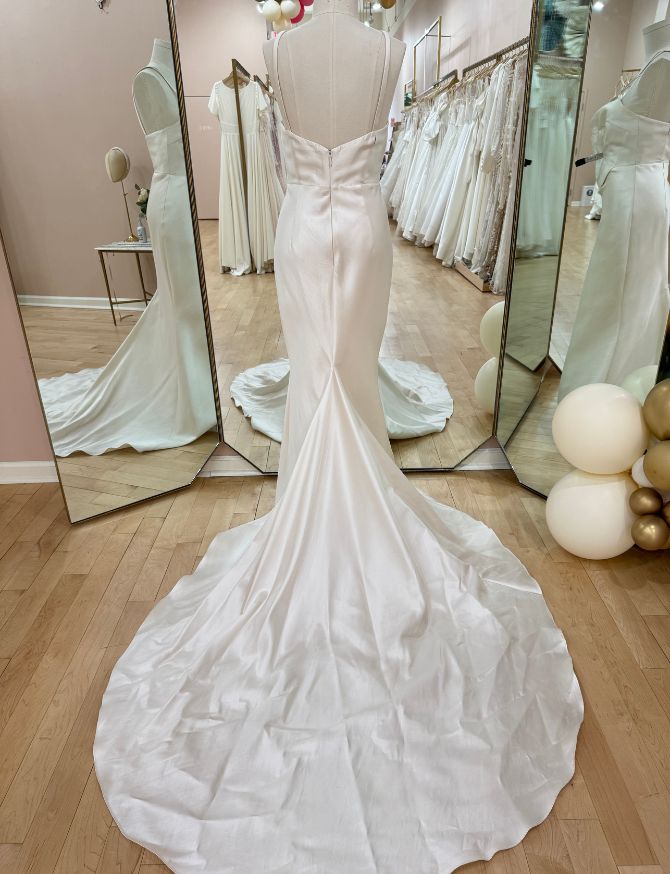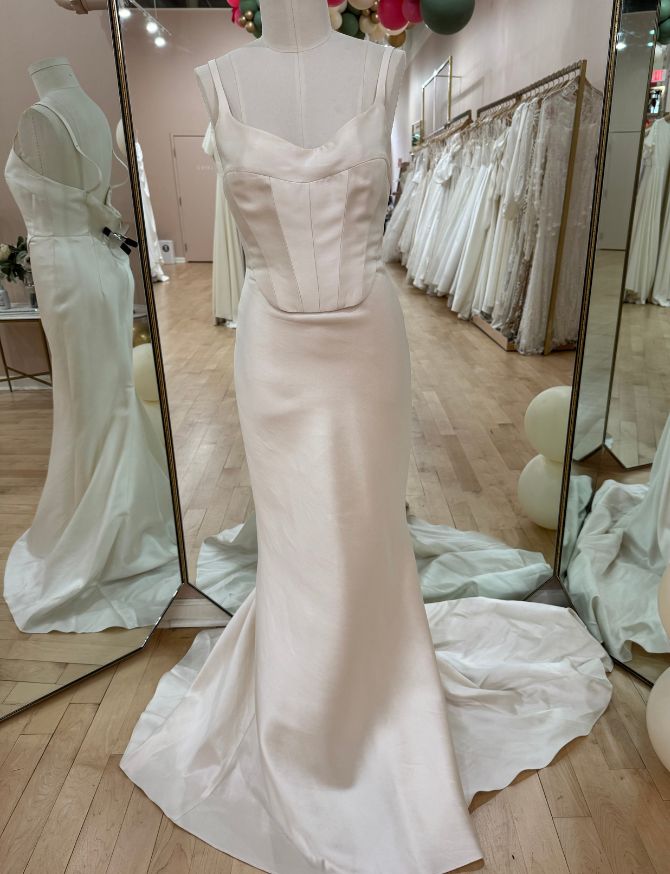Square neckline, basque waist gown with flat straps and a fit to flare skirt.