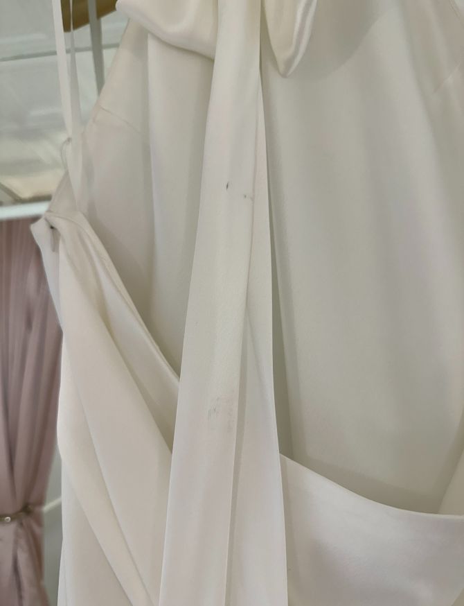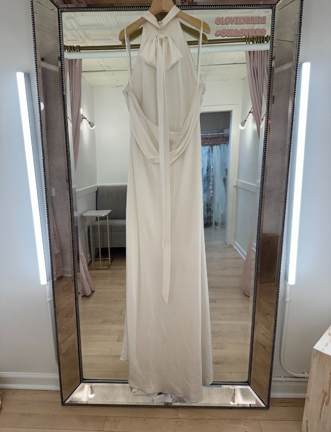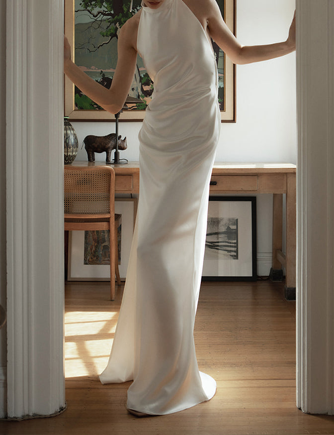 Bias-cut halter neck silk dress with leg slit and open cowl back with detachable back bow. The gown has a side zipper.