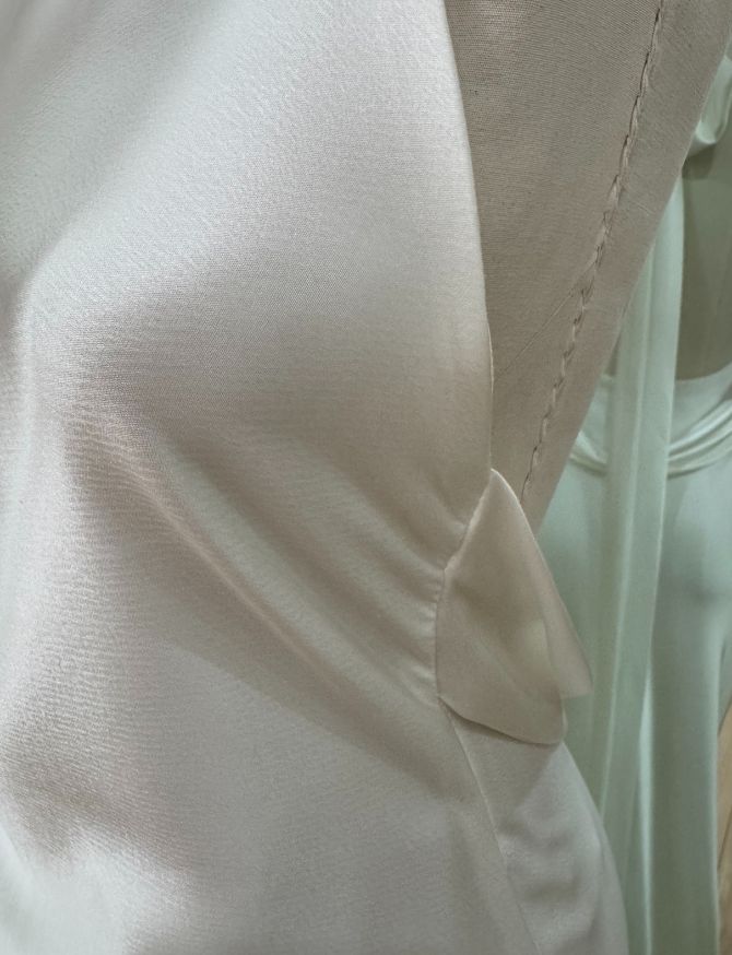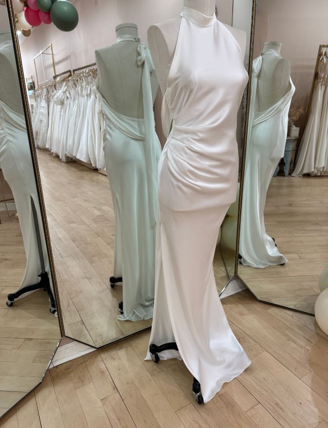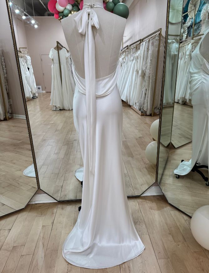 Bias-cut halter neck silk dress with leg slit and open cowl back with detachable back bow
