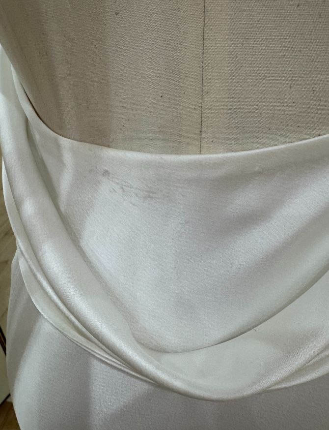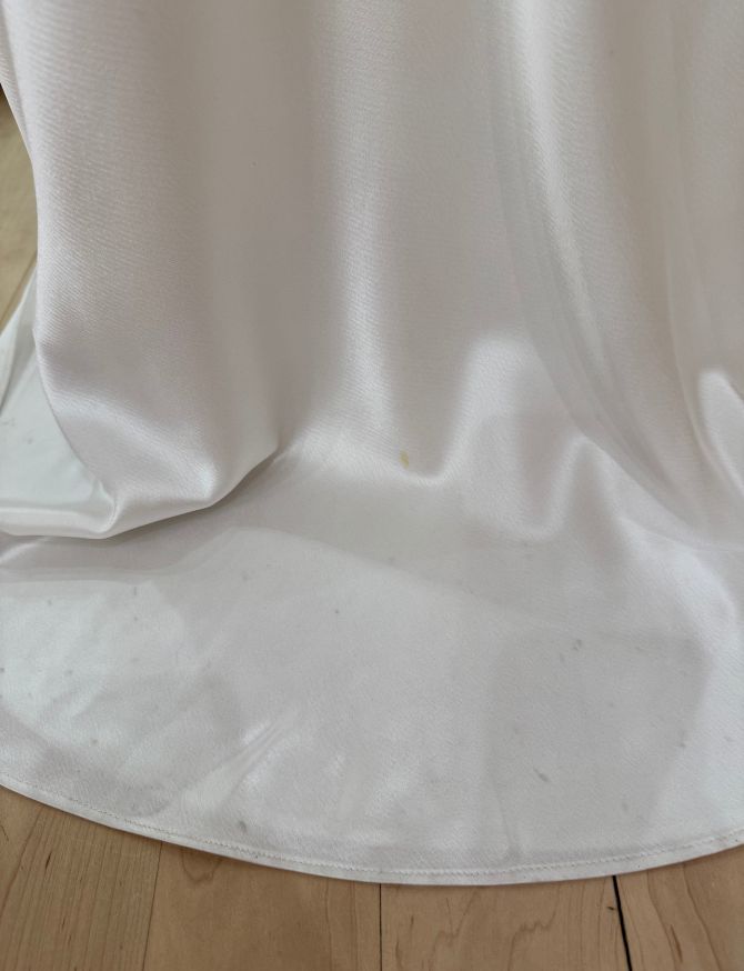 Gown would benefit from dry cleaning as there are marks on the train. Minor fabric imperfections at the back waist line as shown in photos.