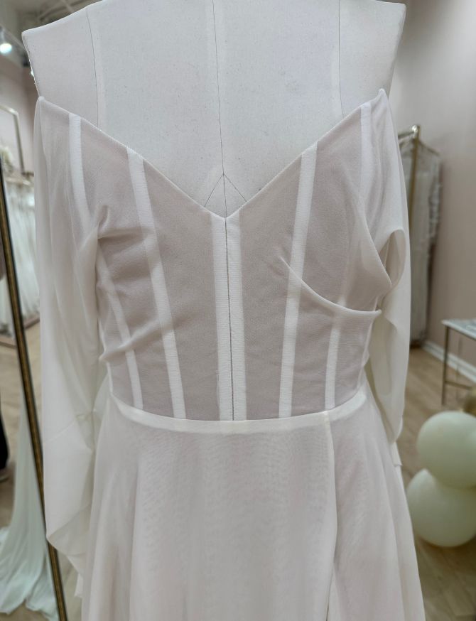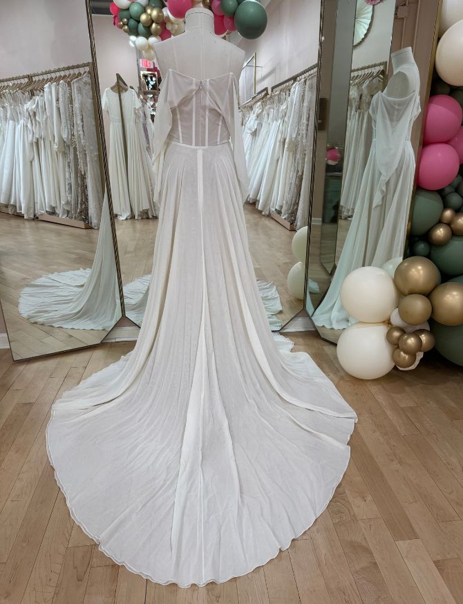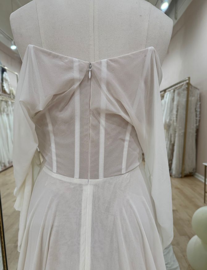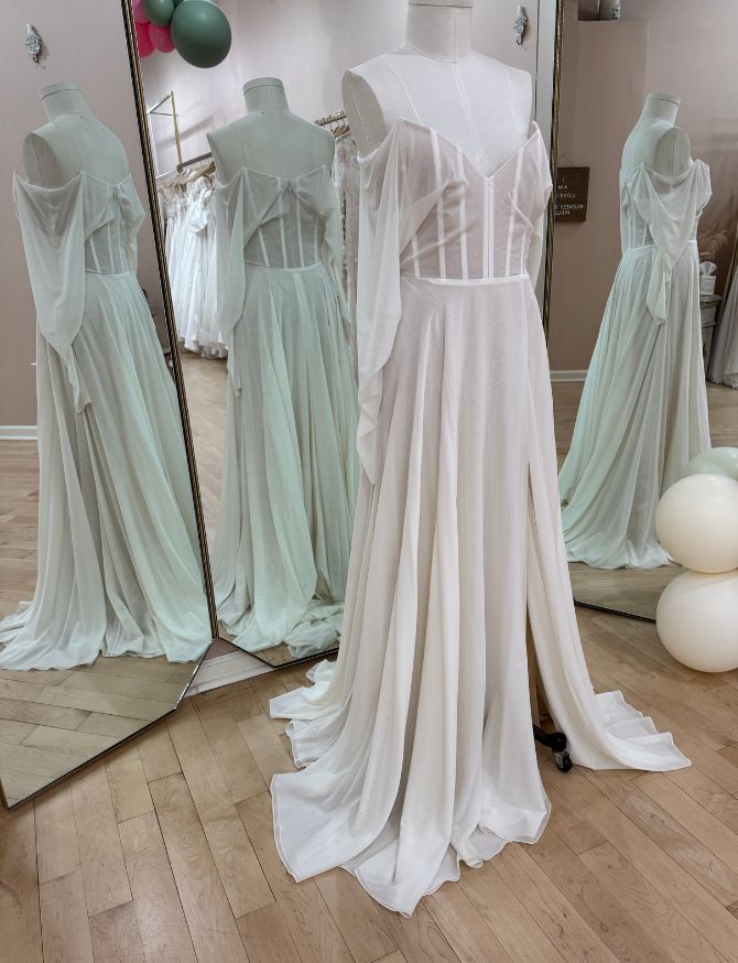 Layla is a silk chiffon off-the-shoulder gown with bodice boning detail and slit skirt. Very light weight and flowy.