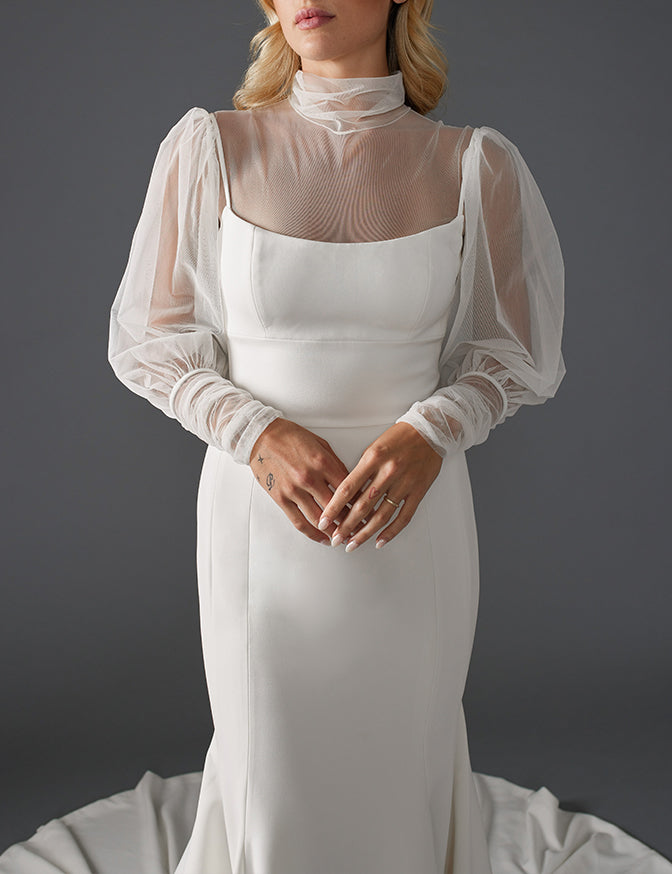 Soft sheer tulle layering piece with ruched high neck and subtle puff sleeves.