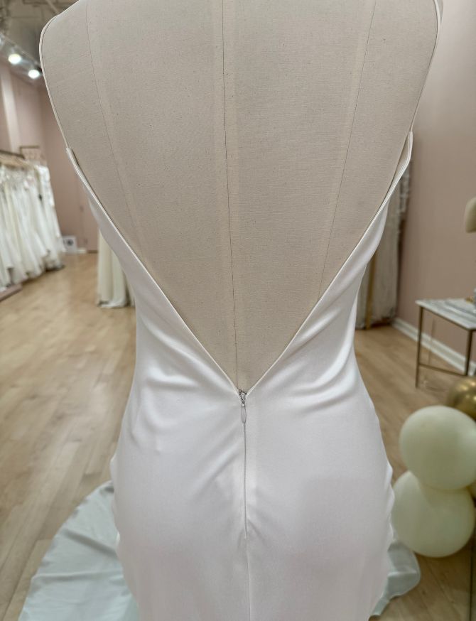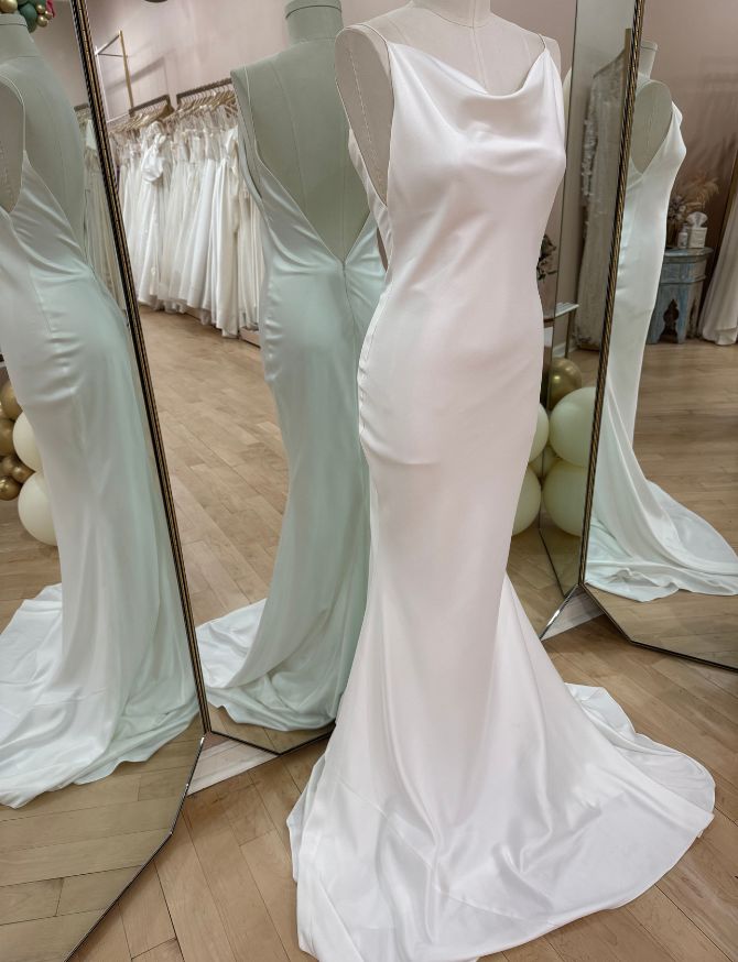 Bias cut slip dress with high cowl drape neckline and stunning low V back.