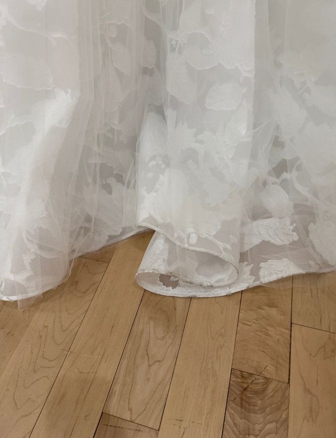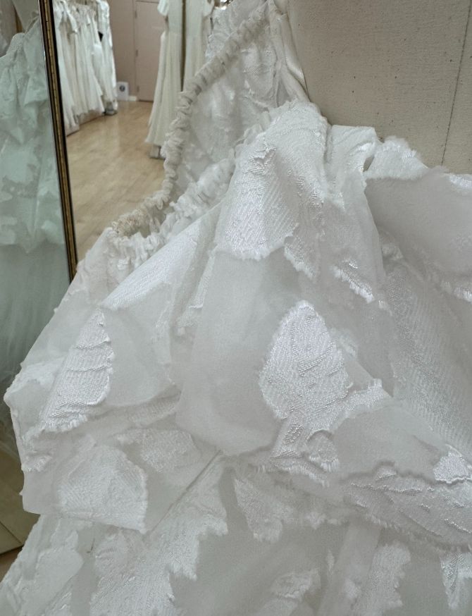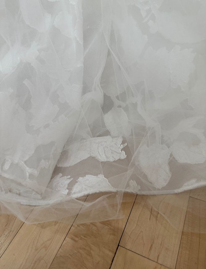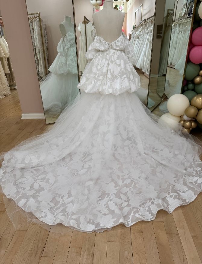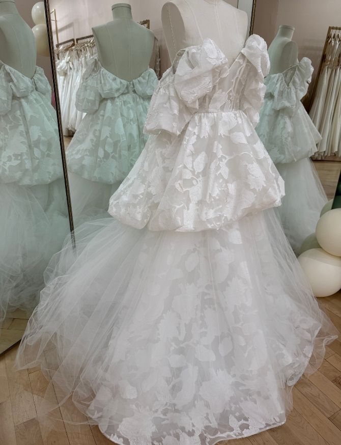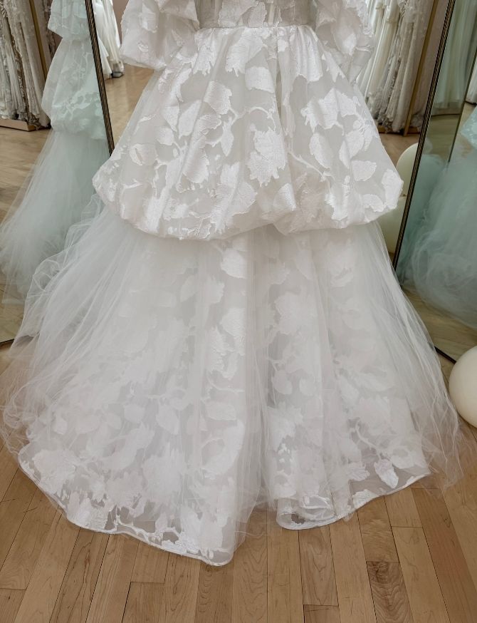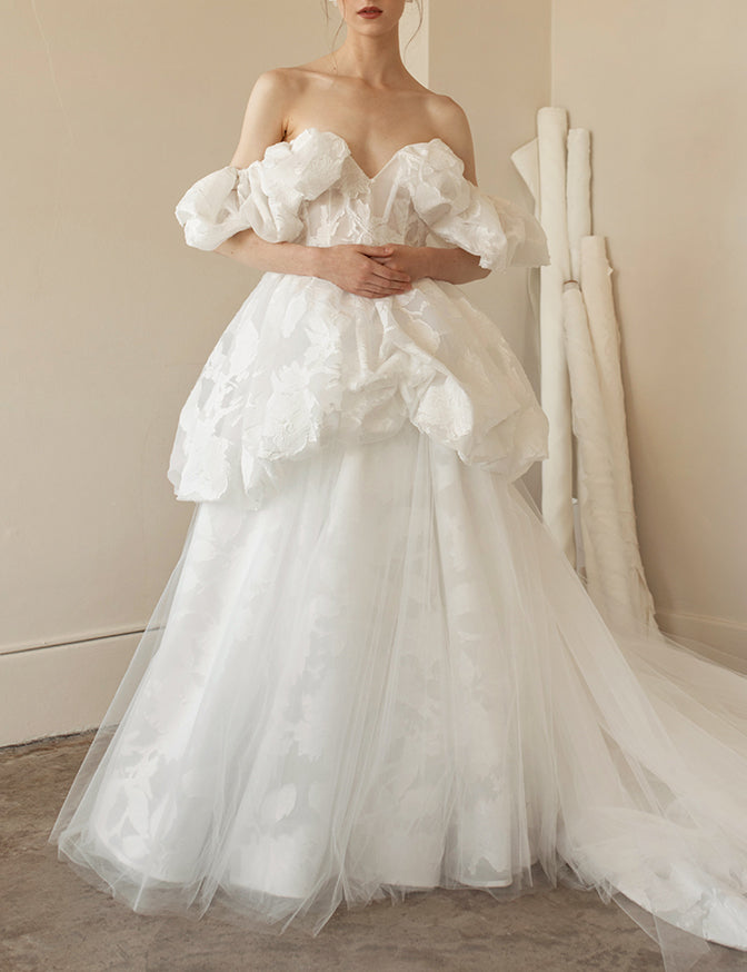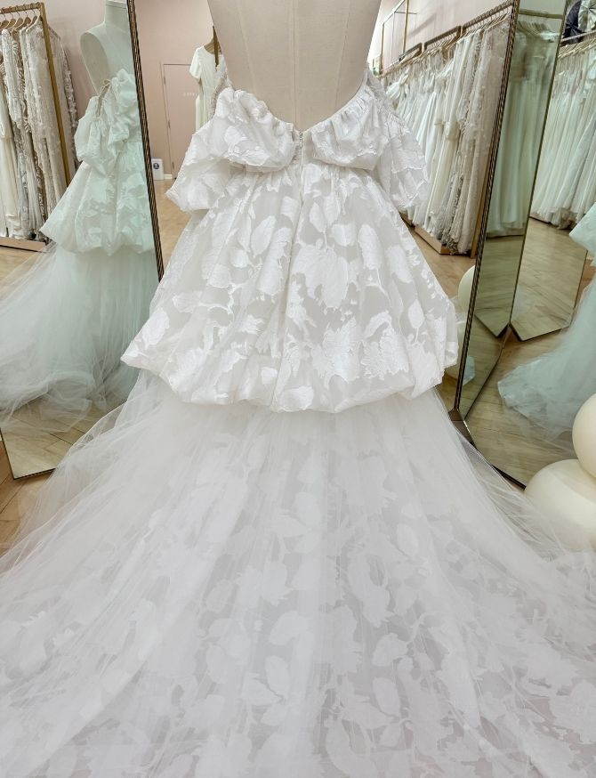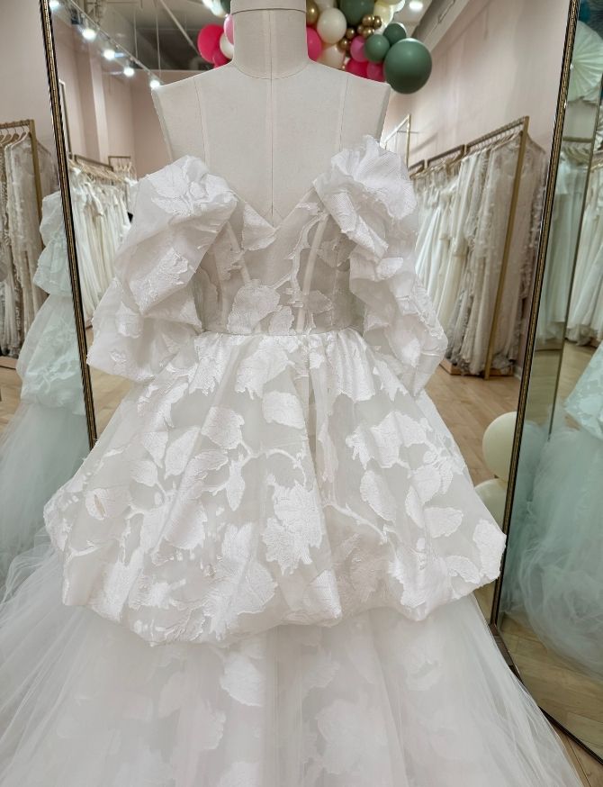 Sienna is a showstopper. Structured bodice with a sweetheart neckline and bubbled off the shoulder sleeves. The top layer of the skirt has a flouncy bubble hem. Tulle and burnout organza flow below leading into a full train.